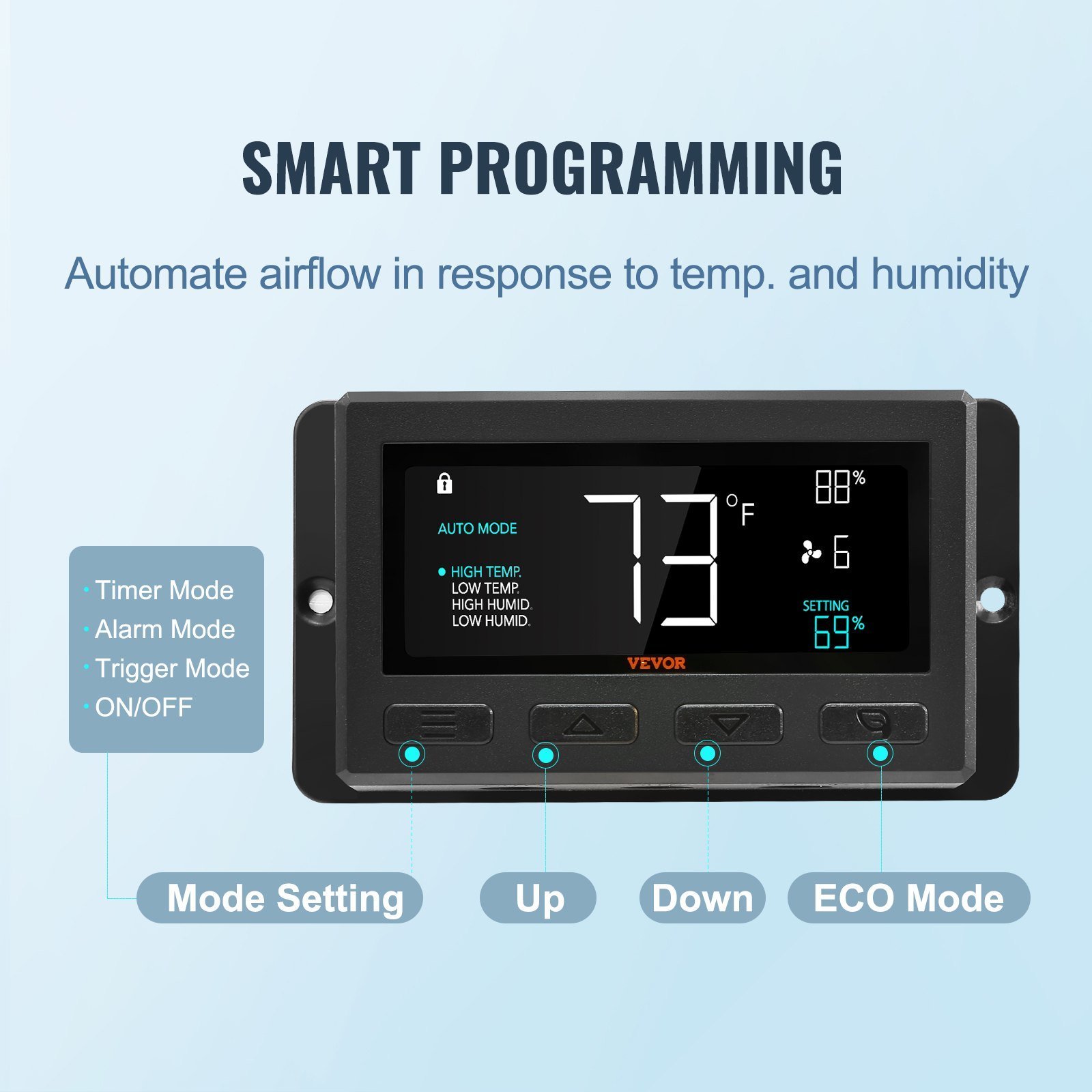 3.Smart Programming: We are equipped with an intelligent controller! Not only do you have temperature and humidity triggers, but it also allows you to set up to 10 speeds that will respond to changes in them. You won't miss a thing and will always be ready to adapt! There are multiple modes, allowing you to adjust as you wish. Timer and alarm modes are available on demand.